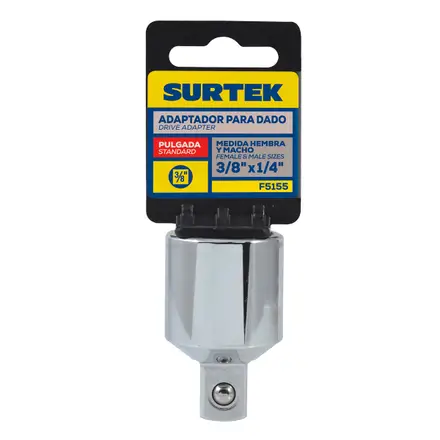 El adaptador para copa Surtek de 3/8" hembra a 1/4" macho es un accesorio diseñado para trabajar con dados de diferente cuadro utilizando el mando correcto, facilitando la compatibilidad entre herramientas. Está fabricado en cromo vanadio, lo que le brinda alta resistencia al desgaste y mayor durabilidad en trabajos mecánicos y de mantenimiento profesional.