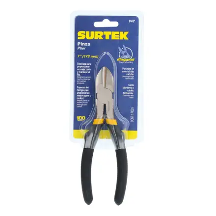 Alicate Surtek para electricista de 7″, robusto y preciso para cortes diagonales seguros.