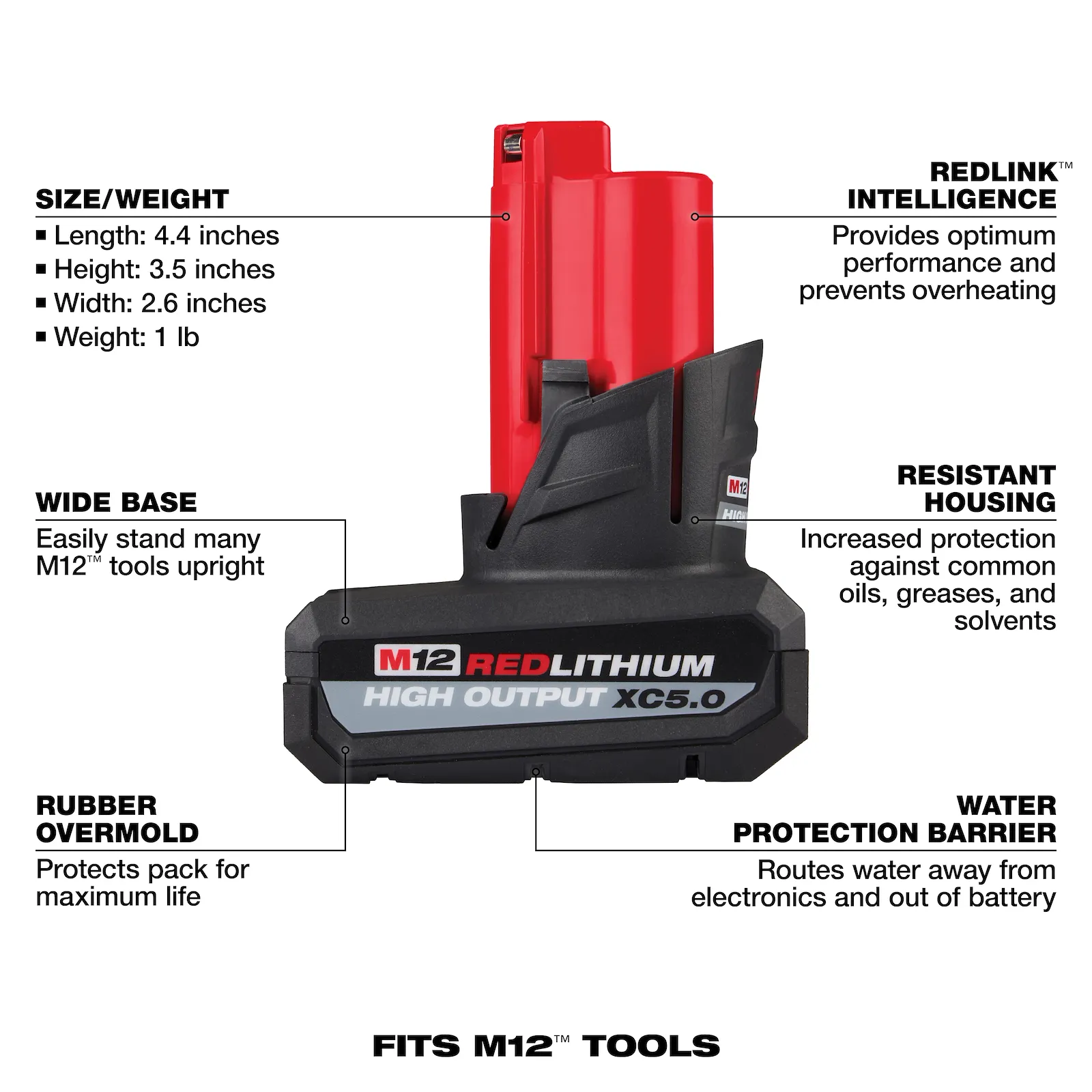 La batería M12™ REDLITHIUM™ HIGH OUTPUT™ XC5.0 ofrece un 25% más de potencia y funciona un 25% más fría que otras baterías M12™ REDLITHIUM™ XC. Este aumento de rendimiento eleva la capacidad de todo el ecosistema M12™, impulsando herramientas M12 FUEL™ en aplicaciones exigentes. Proporciona energía constante sin caídas, mayor autonomía por carga y desempeño confiable incluso en climas extremos (hasta −18 °C). Su carcasa resistente protege contra aceites, grasas y solventes, mientras la inteligencia REDLINK™ optimiza el rendimiento y previene sobrecargas. Compatible con más de 125 soluciones M12™.