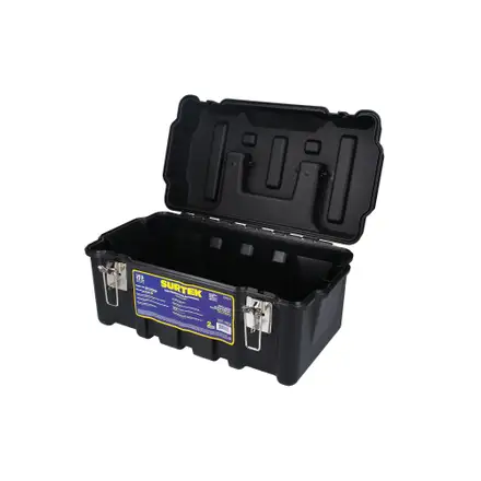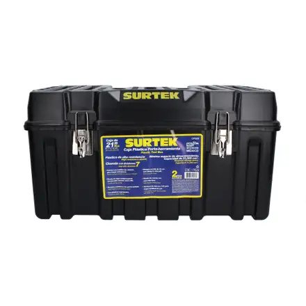 La caja plástica Surtek de 21" está fabricada con plástico de alta resistencia y reforzada con costillas estructurales que aumentan su durabilidad en ambientes de trabajo exigentes. Sus broches metálicos con porta candado ofrecen mayor seguridad, mientras que la tapa antiderrapante —con apertura de 110° y bisagra corrida— permite incluso pararse sobre ella sin riesgo.