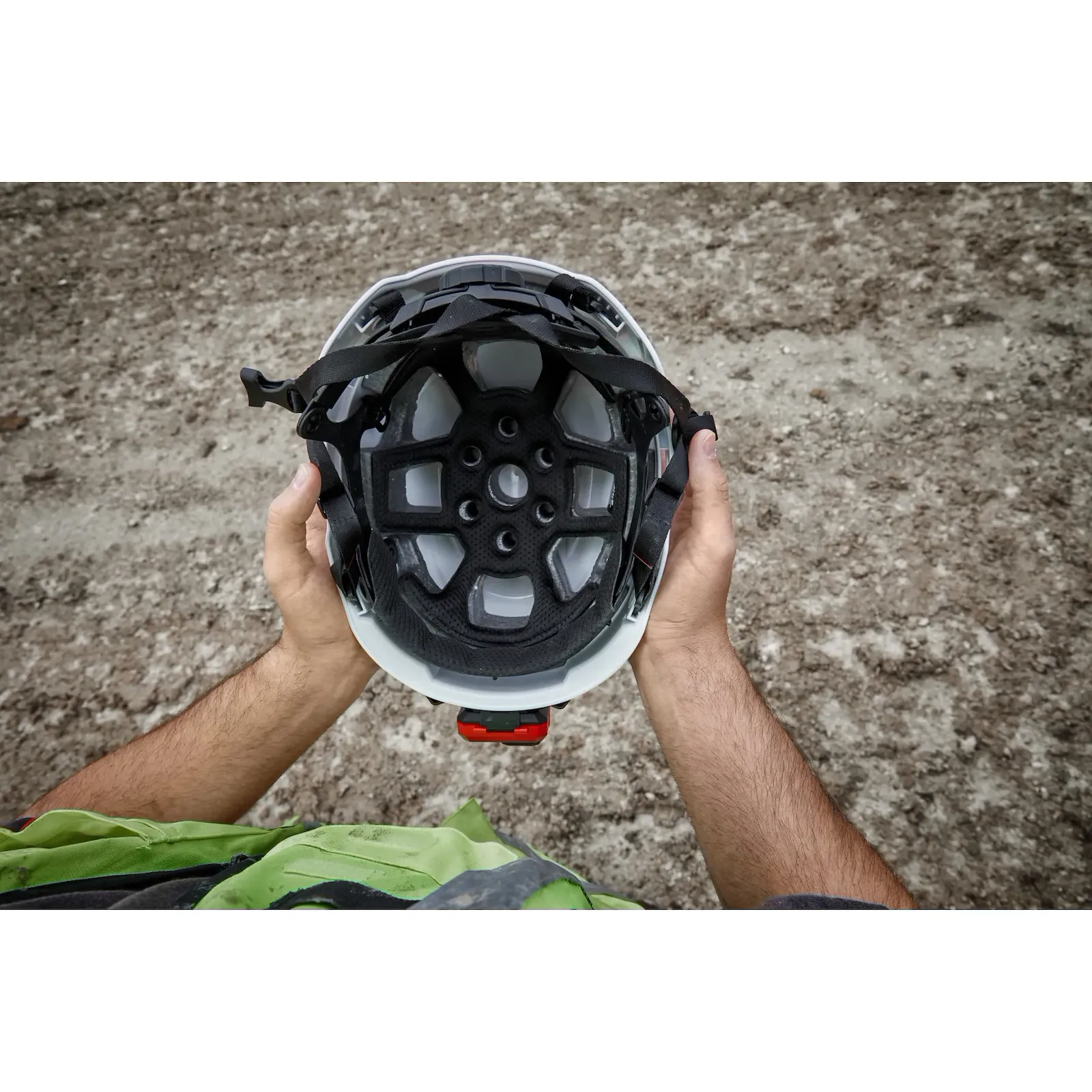 El casco posee una suspensión acolchada con trinquete basculante ajustable, correa de barbilla con cinco hebillas para mayor seguridad y comodidad, y una banda antimicrobiana que evita la acumulación de olores y bacterias. Tanto la banda para el sudor como el forro y la correa son removibles y lavables a máquina. Este casco cumple con la norma ANSI Tipo 2 y puede personalizarse con su logotipo.