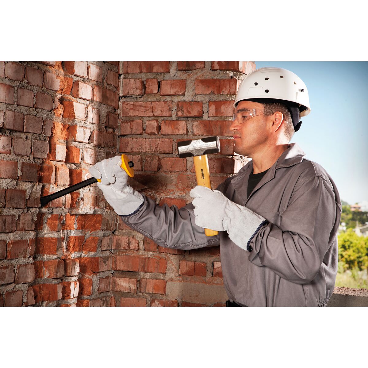 Cincel de 10" con empuñadura de protección, diseñado para corte, ranurado y demolición ligera. Fabricado en acero de alta resistencia, ofrece precisión y seguridad al absorber impactos y proteger la mano durante el uso.