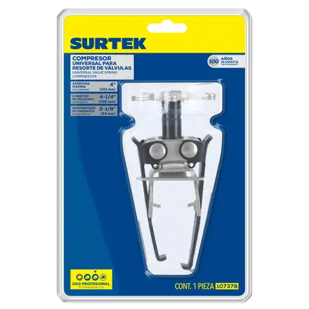El compresor universal para resorte de válvulas Surtek permite remover los resortes de válvulas sin retirar la culata del motor, optimizando tiempo y esfuerzo en trabajos de mantenimiento automotriz. Está fabricado en acero resistente, lo que garantiza durabilidad y desempeño confiable en uso profesional dentro del taller.