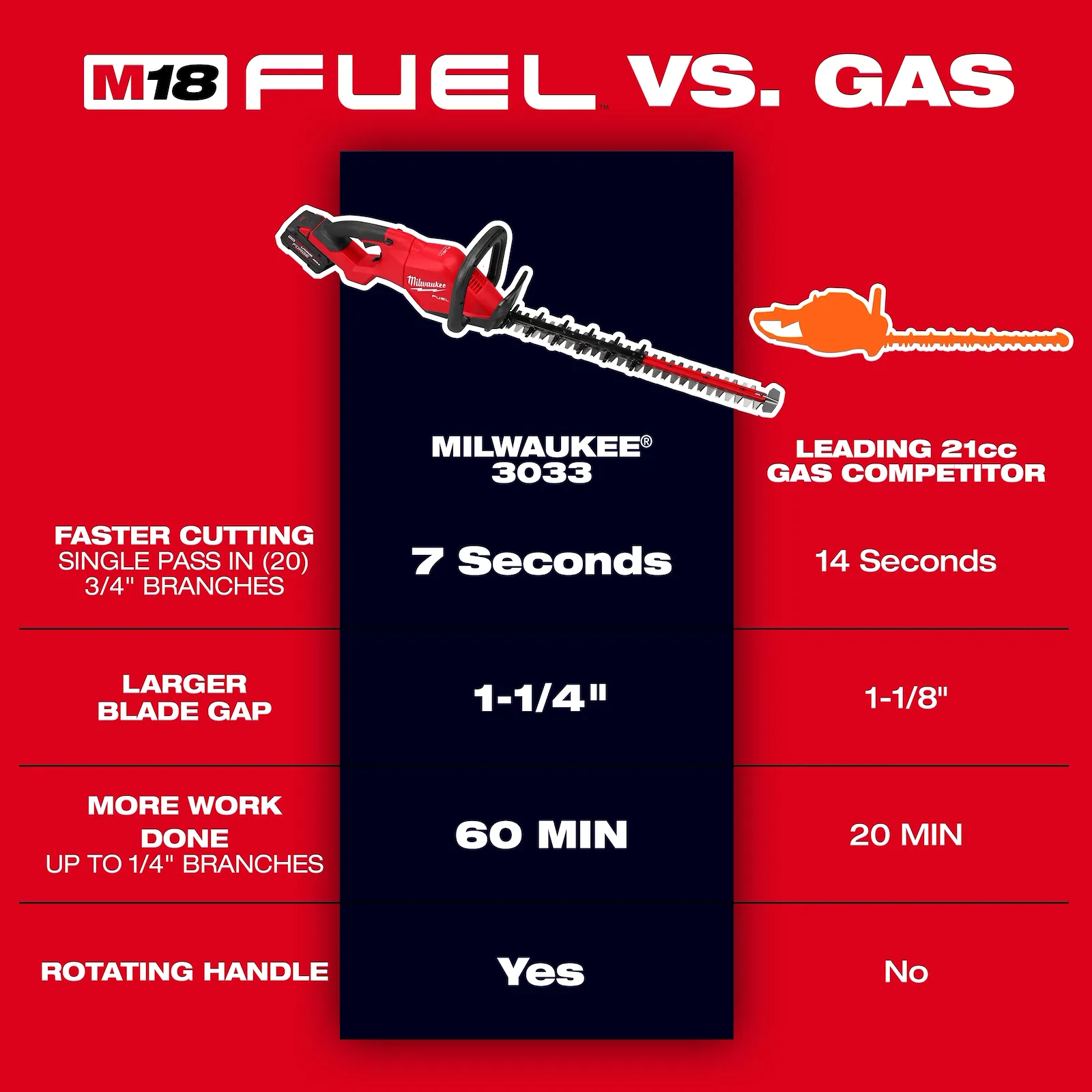El cortasetos M18 FUEL™ de 24" supera las exigencias de potencia, rendimiento y durabilidad del mantenimiento paisajístico profesional. Su motor sin escobillas POWERSTATE™ permite cortar ramas de hasta 3.18 cm de diámetro para podas intensivas y un recorte más rápido. Incorpora empuñadura giratoria, cuchillas de doble filo y accesorio recolector de residuos, brindando mayor control y cortes limpios. La inteligencia REDLINK PLUS™ optimiza la comunicación entre herramienta y batería para máximo desempeño, protección y productividad. Es totalmente compatible con más de 275 soluciones del sistema M18™.
