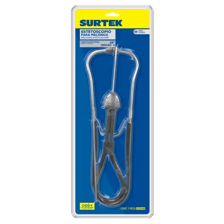 El estetoscopio para mecánico Surtek de 12 pulgadas permite localizar rápidamente ruidos en el motor, cojinetes, transmisión, diferencial y baleros. Incorpora un diafragma súper delgado que amplifica el sonido, facilitando diagnósticos precisos en talleres automotrices. Fabricado en aluminio, es ligero, resistente y adecuado para uso profesional.