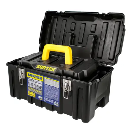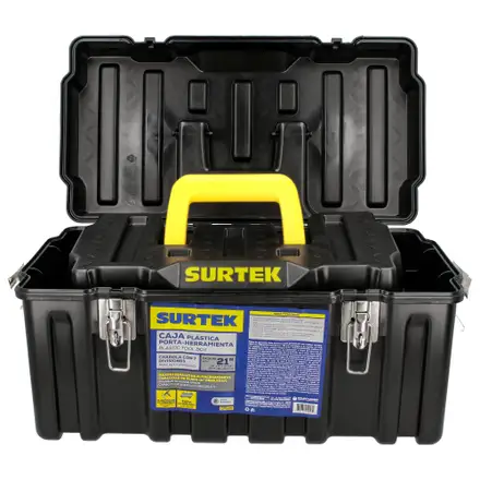 El set de cajas organizadoras Surtek de 21" y 17" está fabricado en plástico de alta resistencia y diseñado para ofrecer una solución robusta de almacenamiento. La caja de 21" no incluye charola, mientras que la caja de 17" incorpora una charola con 6 divisiones, ideal para piezas pequeñas y accesorios.