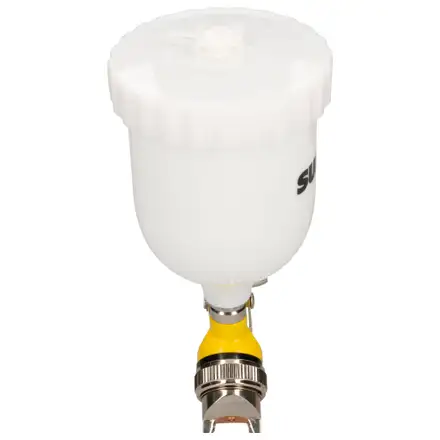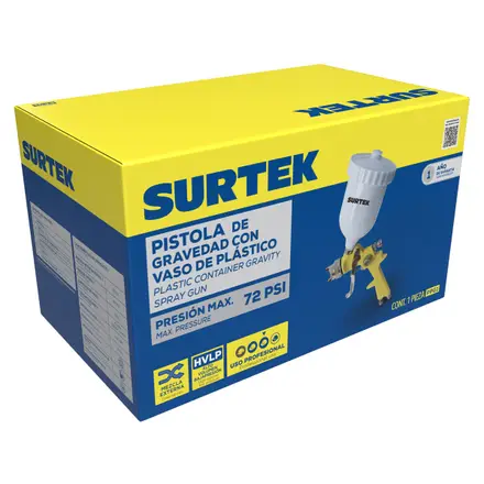 La pistola para pintar terminados Surtek está diseñada para ofrecer acabados uniformes y de alta calidad con mayor eficiencia y ahorro de material. Cuenta con mezcla externa, alimentación por gravedad y flujo de aire no continuo, lo que permite un control preciso durante la aplicación. Incorpora controles independientes de material, aire y abanico, y un vaso plástico de 600 ml, ideal para trabajos profesionales de pintura y retoque.